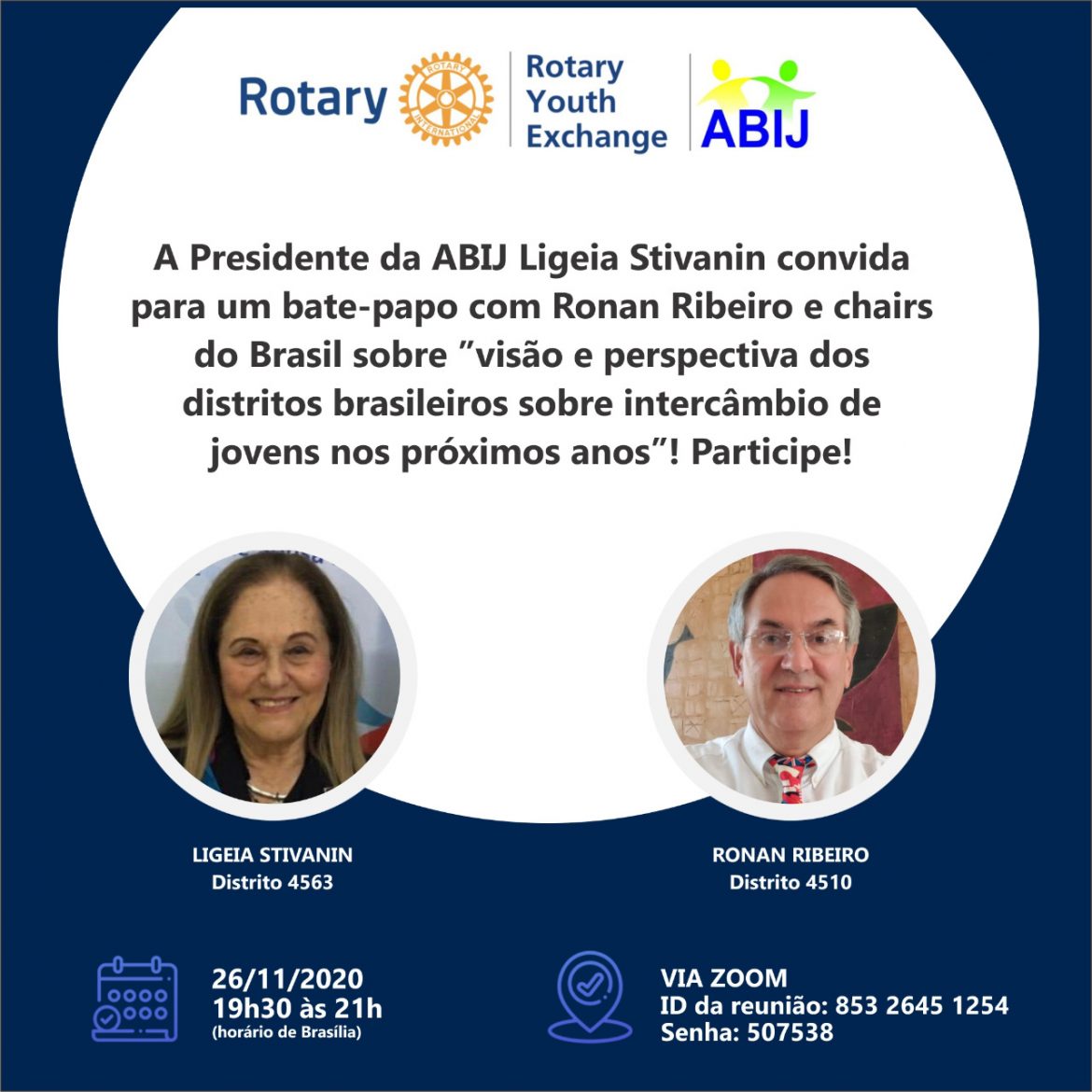 Pela primeira vez, o RYE – Rotary Youth Exchange participou da Plenária do Instituto Rotary do Brasil, graças ao trabalho do Diretor de Rotary International Mário César Martins de Camargo. Na tarde de 12 de setembro, a presidente da ABIJ, Ligeia Stivanin, e 2ª secretária da ABIJ, Anaides Pimentel Orth, falaram sobre o programa.
